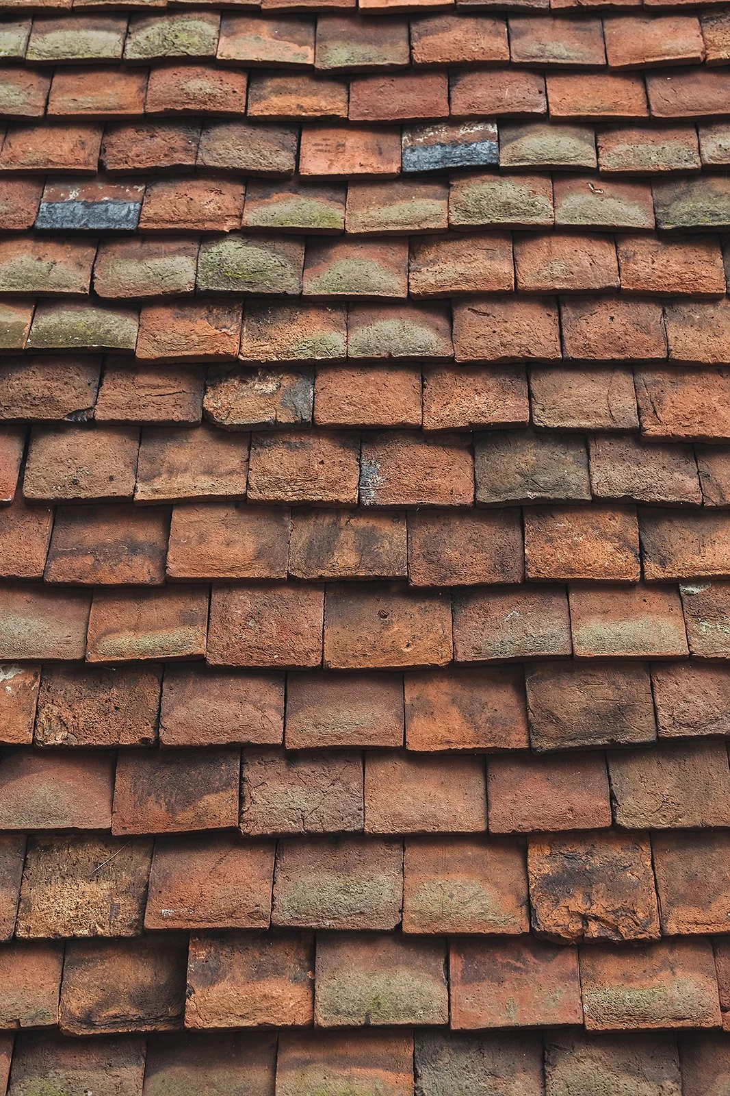 Close-up of a traditional Sussex Keymer tile roof with overlapping reddish-brown clay tiles, some with moss and weathering. Michael Stenning Roofer, Michael Stenning Roofing, Stenning Roofers